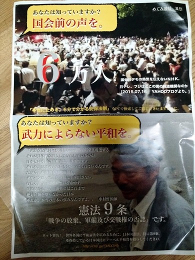 목회자가 정치적인 쟁점을 가지고 입장을 피력하는 것은 쉽지 않은 일이다. 왜냐하면 정치적 이슈는 호불호가 확실하기 때문에 50%의 지지를 얻더라도 50%의 지지를 잃기 때문이다. 그럼에도 불구하고 이리에 목사님은 그 길을 택하셨다. 그리고 우리 단기선교팀이 왔을때 위 모양의 전단지를 가지고 메이노하마 역에서 전단지를 나눠주는 일을 했었다.
