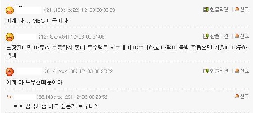 상황이 이렇게까지 흘러가니 오히려 노무현을 지지했던 계층에게도 노무현은 비난받았다. 그 한나라당 정권과 뭐가 다르냐는 것이다. 그래서 노무현 정부는 원래 지지층과 그 반대쪽 모두에게 비난을 받는 정부였고 그 이후 결과는 모두가 알다시피다. 이명박이 대통령이 되었고 노무현은 검찰의 무리한 수사를 받고 결국 이 세상을 떠나고 말았다.