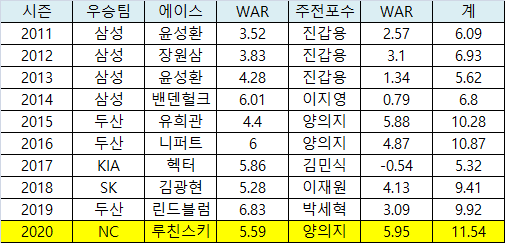 올해의 승리는 팀 다이노스 모두의 승리다. 그래서 그냥 넘어가려다가 나승븜이가 구단 V-Log에 찍은 영상을 보고 생각을 바꿨다. 정규시즌 MIP는 최근 10년동안 우승팀 중 스탯티즈 기준 WAR(대체선수 대비 승리기여도, 리그에서 가상의 대체선수가 1의 수치를 가진다고 가정한다. WAR가 5.95라는 뜻은 혼자서 5.95승에 더 기여했다는 뜻이다.)가 가장 좋은 배터리(에이스+주전포수)였던 루친스키와 양의지다.