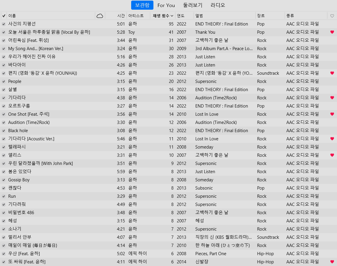 윤하 콘서트 예매를 잡아놓고 아이튠즈 보관함에서 어떤 노래를 많이 들었는지 한번 체크해봤다. 아무래도 2010년쯤에 아이팟 클래식을 사면서 아이튠즈를 쓰기 시작했기 때문에 생각보다 재생횟수가 많지는 않은데 옛날에 많이 들었던 추억의 노래들이 참 많이 있었다. 아마 내가 20대 중반까지는 정말 윤하 노래를 많이 들었던 것 같다. 그러면서 한 번쯤은 윤하 콘서트를 가보고 싶다는 생각을 해보지 않았을까?