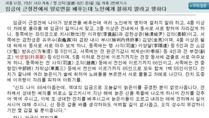 여기에 세종이 근정전에서 양로연을 베푸는데, 4품 이상의 품계를 가진 사람으로 전 전 부정(副正) 박영필(朴英弼)이 등장한다. 여기서 부정이란 관직은 종 3품의 관직으로 각 관서의 부책임자를 뜻하는 것이다.