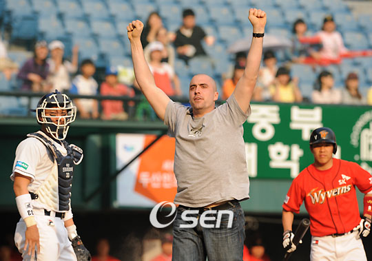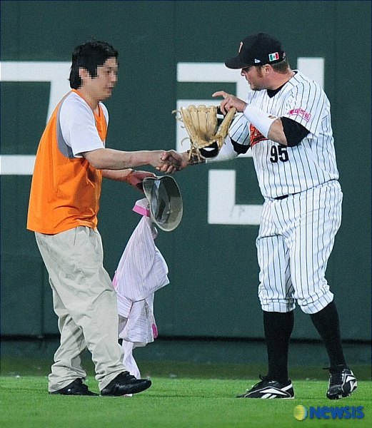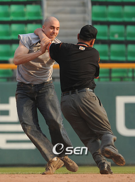 지난 4월 19일, 잠실구장(두산:SK)에서는 백인 관중 분이 난입하는 경우도 있었죠. 그분도 진짜 웃겼던 게 3루쪽으로 난입해서는 홈으로 막 뛰어서 슬라이딩으로 들어가고, 다시 일어서 1루찍고 2루찍고 3루까지 내달리다가 2루심한테 태클을 당해서 넘어지려다가 다시 일어나서 또 다시 달리시더군요. 참 재미있었습니다.